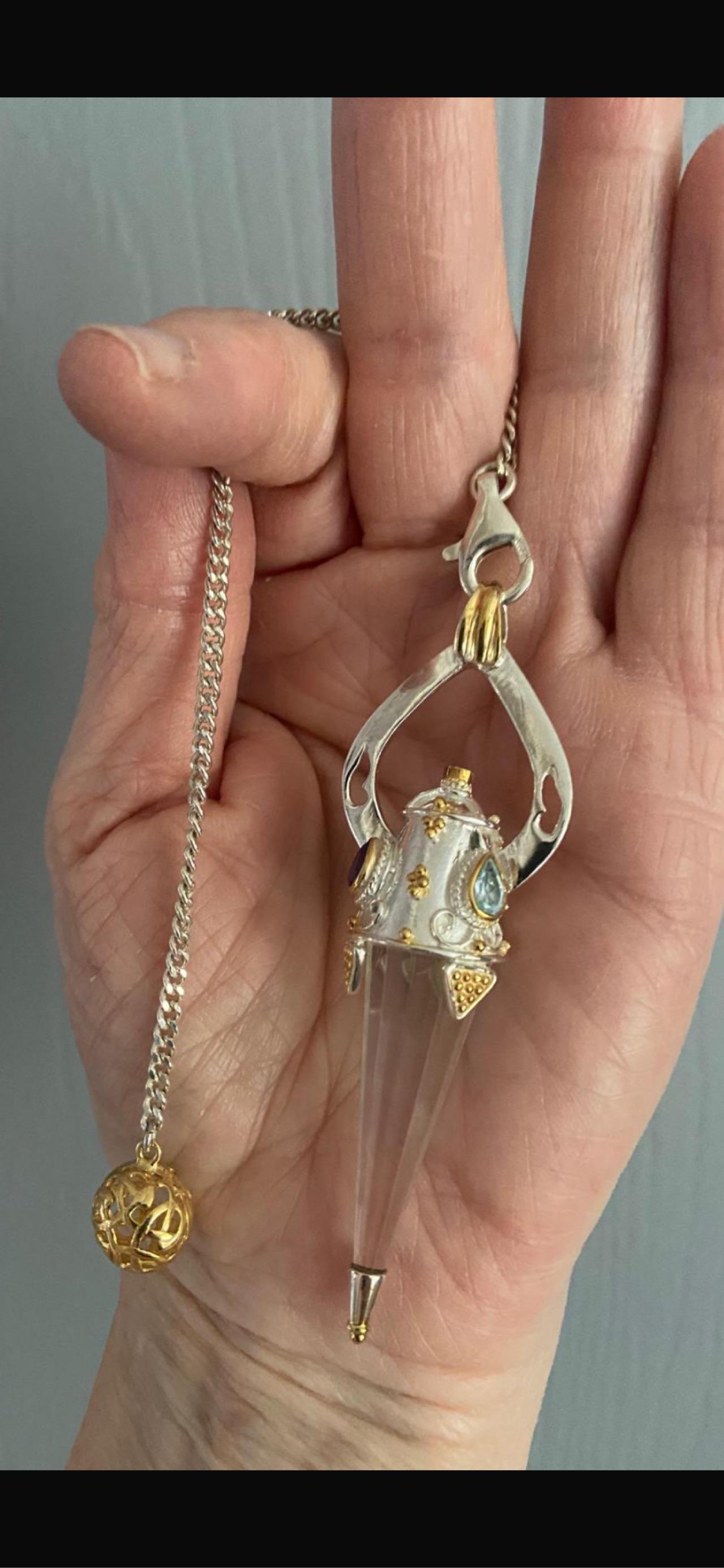 This stunning pendulum features a highest quality Vogel style quartz crystal. This cut helps to amplify and transmit the energies of the master crystal quartz to guide you and manifest your highest intentions.